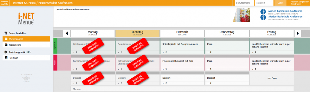 Die Bestellung des Mittagessens erfolgt über die Plattform i-NET-Menue. Eine Bestellung oder Stornierung ist täglich bis 8.00 Uhr möglich: